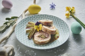 Tagliate a fette e posizionate il coniglio ripieno sul piatto aggiungete del brodo di cottura e guarnite il coniglio con alcuni fiori alimentari.