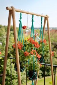 - Inserire i vasi nei fori al centro e tirare le estremità delle corde in alto, legandole ad un anello. Infine, sistemare i Gerani nei vasi e appendere la decorazione ad un gancio nel soffitto.