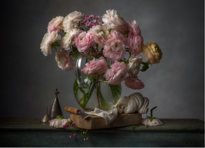 “Utilizzo un’unica sorgente di Iuce, posizionata appena alla mia sinistra, uno sfondo che sfuma da scuro a chiaro, e sulla scena posiziono elementi che alternano lati chiari e Iati scuri, con un contrasto maggiore aI centro della composizione e minore ai lati. Utilizzo almeno tre piani orizzontali che convergono con effetto prospettico per permettere all’osservatore di percepire la sua distanza dal soggetto e, per rafforzare questa percezione, impiego un obiettivo di lunghezza focale più o meno uguale alla larghezza della pellicola o sensore. […] La differenza tra come appare il soggetto e quello che si ottiene e sempre una sorpresa. È qui il fascino della fotografia analogica”. Per informazioni, http://broadbentcj.net/